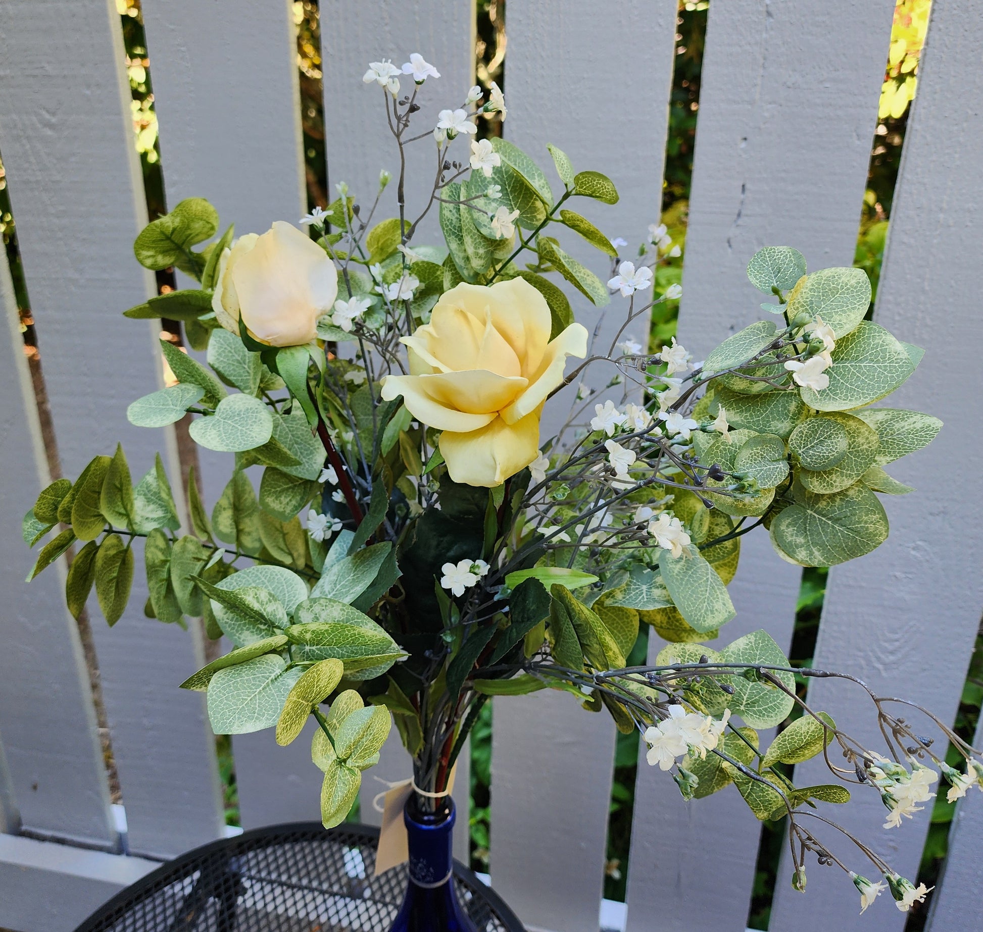 Bright yellow roses and airy gypsophila shine with optimism. A bouquet that radiates joy and encouragement. The blue wine bottle can be included upon request. The bouquet is approximately 25 inches.