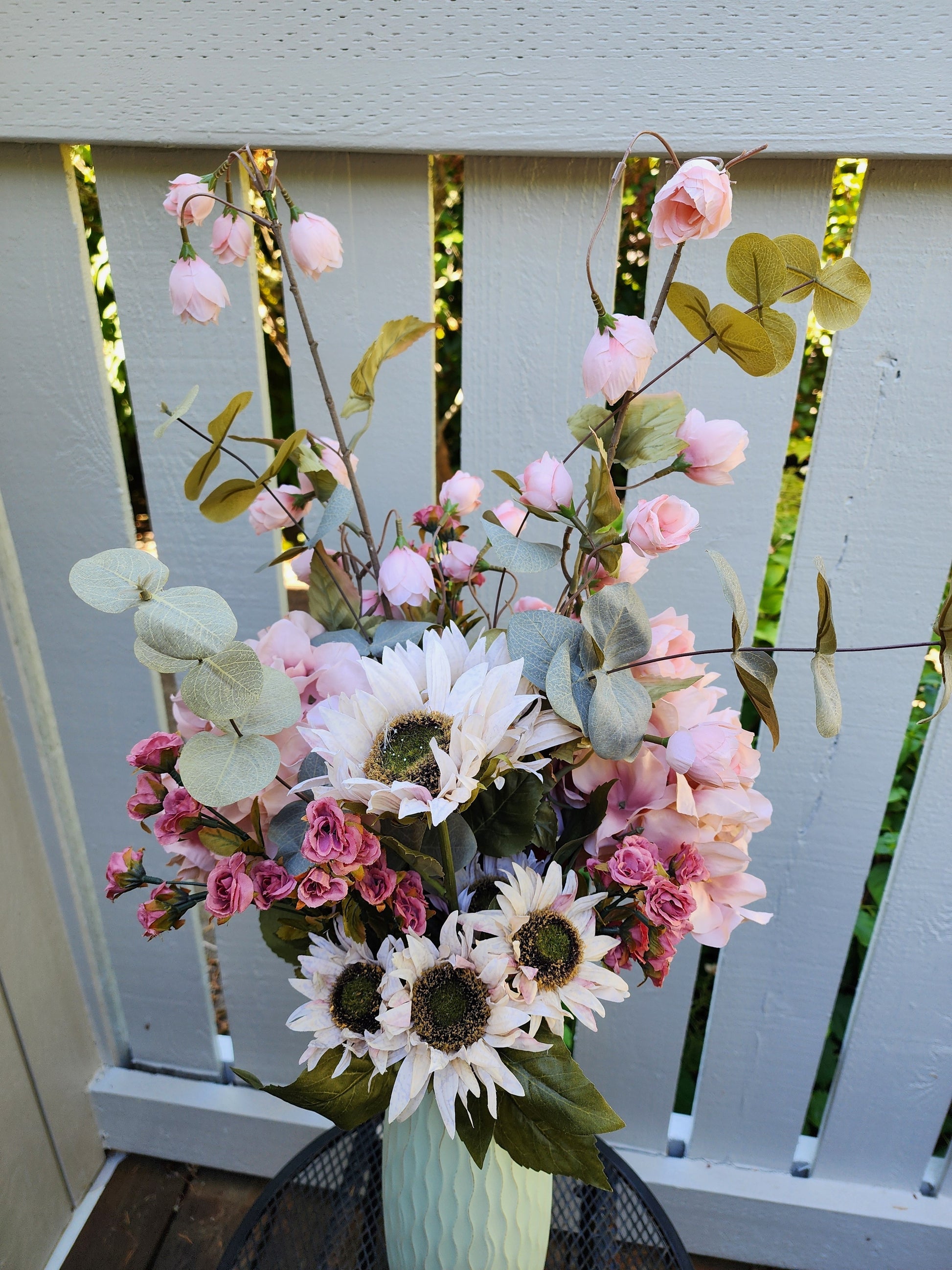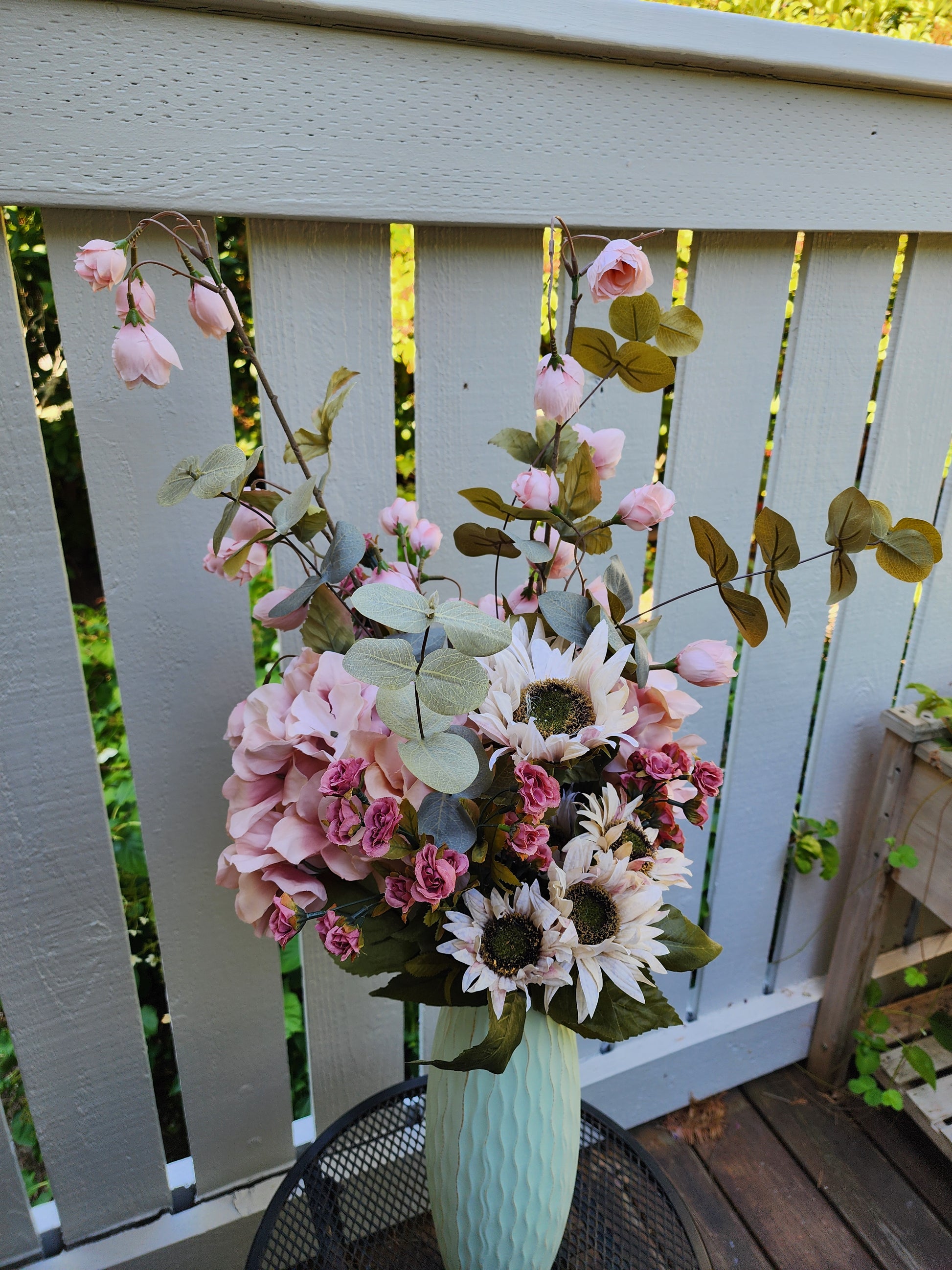 A tender blend of hydrangeas and heart rose spray, this bouquet speaks of love’s warmth and emotional resilience. This bouquet is approximately 30 inches tall. Vase not included.